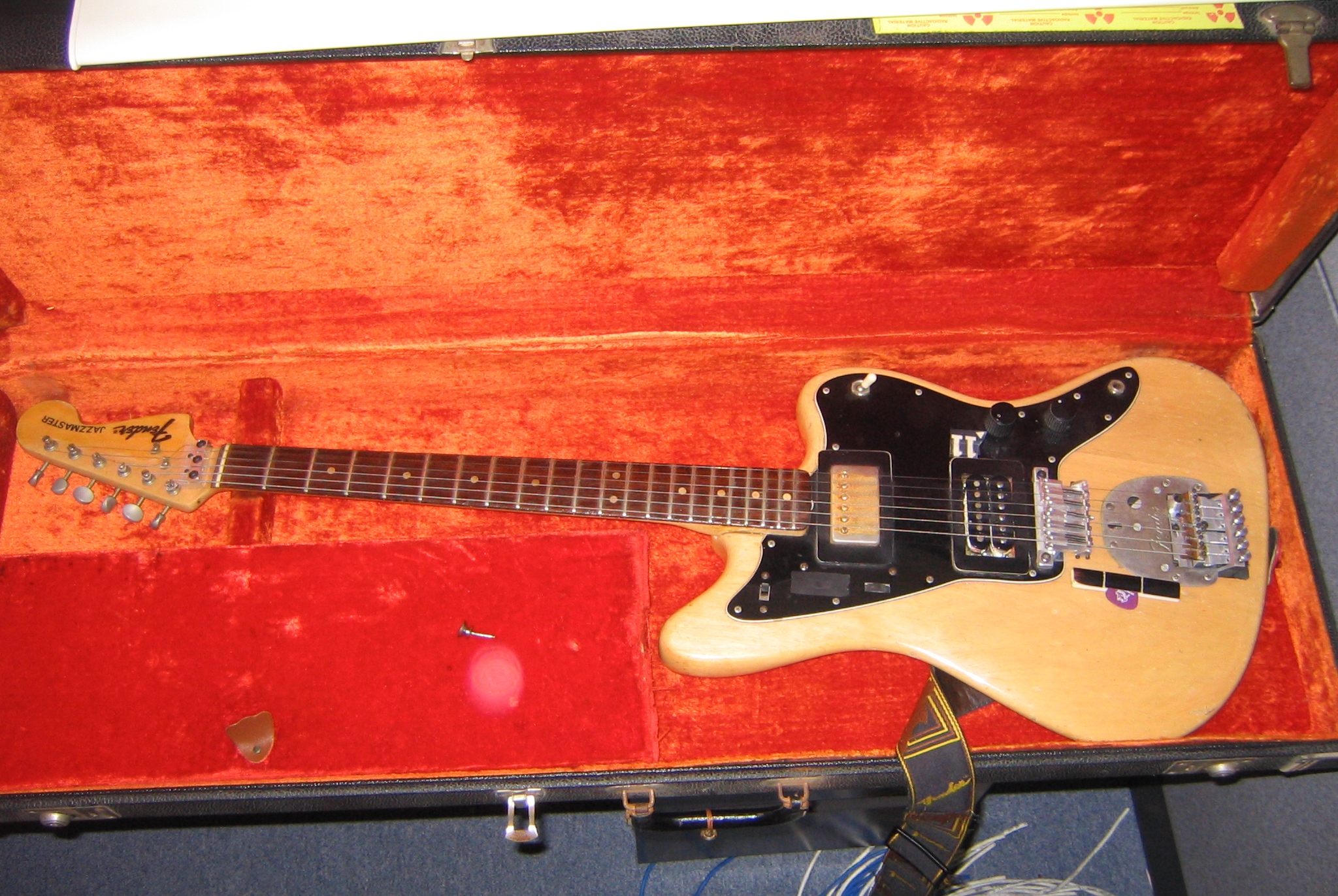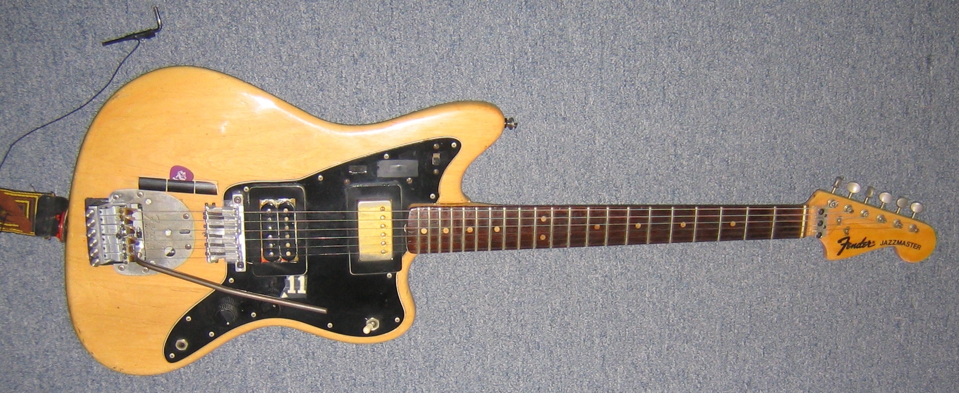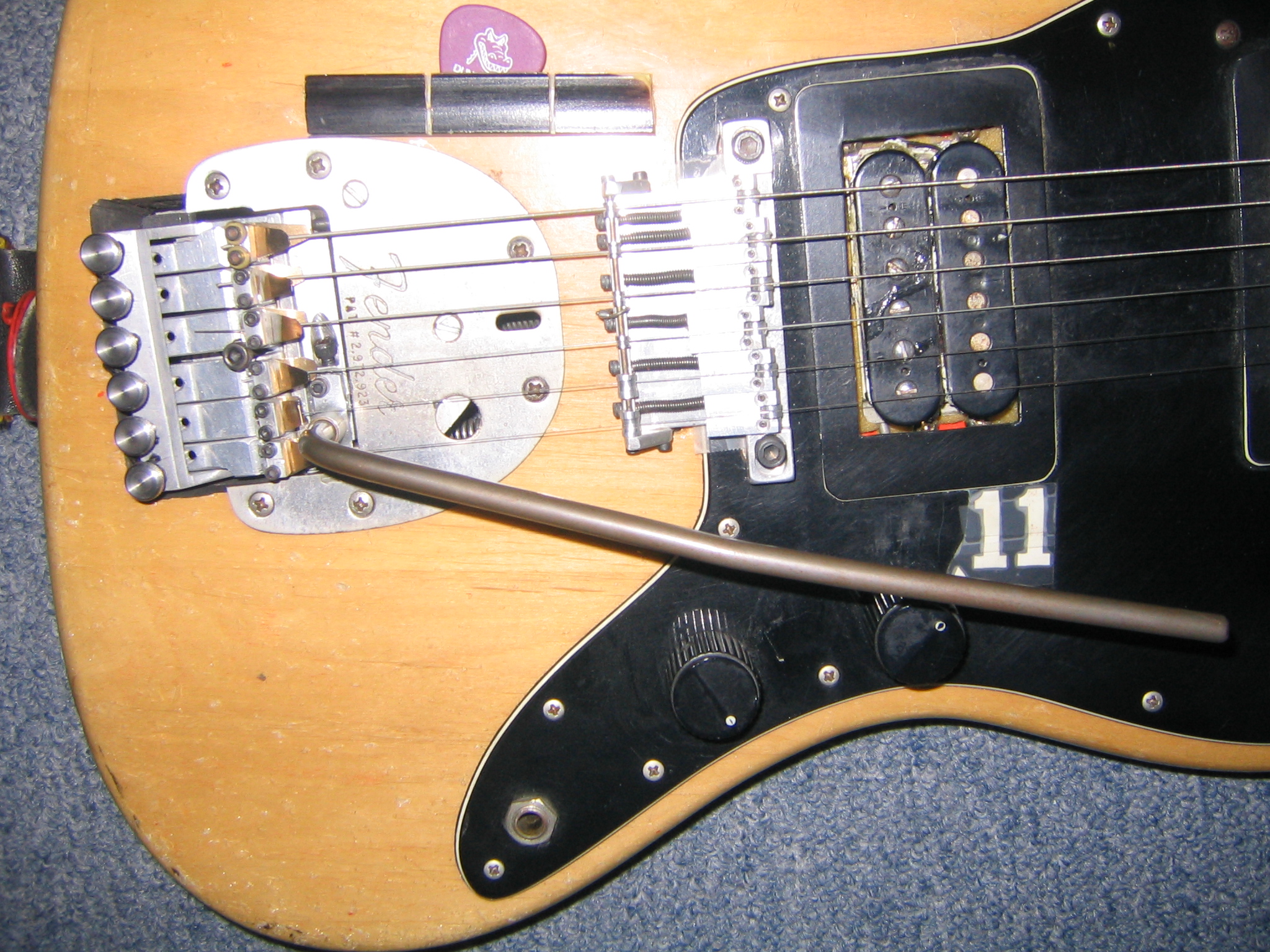 1966 Fender Jazzmaster with Poor Man's Floyd Rose: Here's the short version: I got this guitar in the 6th grade. By sophomore year in college my performing tastes had gone from Springsteen to Eric Clapton and were starting to tend towards Eddie Van Halen. Now you can't pull off Van Halen with a microphonic bridge pickup and even worse, a 22 year old tailpiece vibrato design that wouldn't stay in tune. I was poor but I had machine shop skills