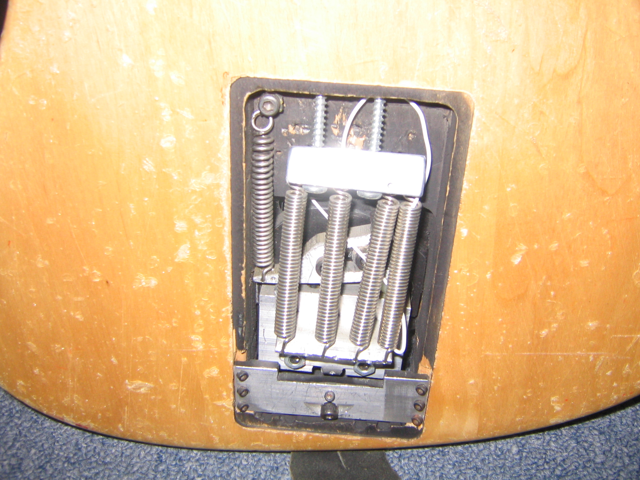 I tried to patent this through MIT. It's a sprung, blocked hard stop so you stay in tune through bends and broken strings but you can still pitch up on the vibrato if you exceed the preload. MIT said no, and a few years later the concept came to market as the Hipshot Tremsetter. I tried one on my Jackson Soloist. This one is better.