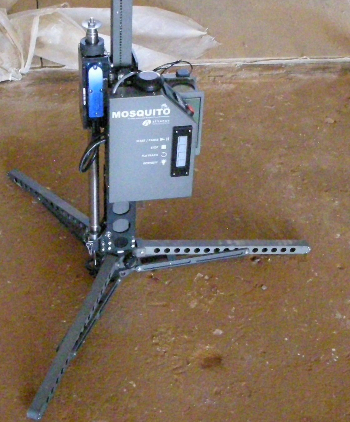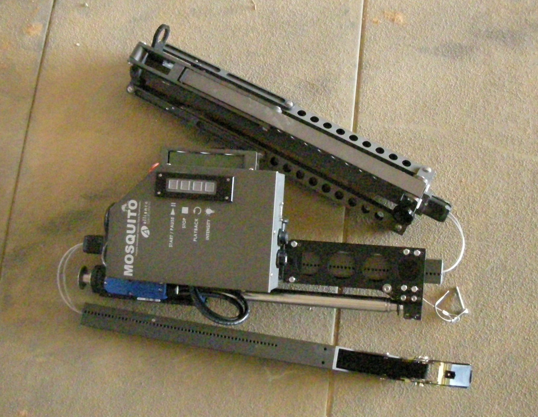 Here's Mosquito broken down into 3 segments just after it's been pulled out of a rucksack. The ratchet crank lever (lower right) slowly puts tension into the central dual cables and the pieces come together. Since there are 2 cables and a 2 pronged mating scheme, they can not go together the wrong way. The Operators need no tools to go through this assembly procedure and start running tests.